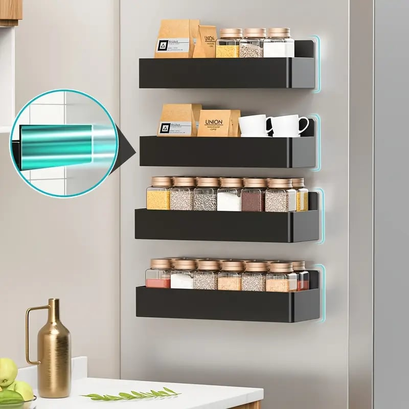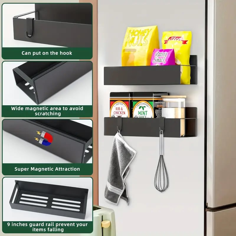 Can be used on all magnetic surfaces of your home, kitchen or laundry room, such as the side wall of your refrigerator to hold spices, oils, utensils, towels or other essentials. Our moveable refrigerator shelf can also be used on the side of an oven, microwave, coffee machine, washing machine, classroom, whiteboard or tools wall for storage.