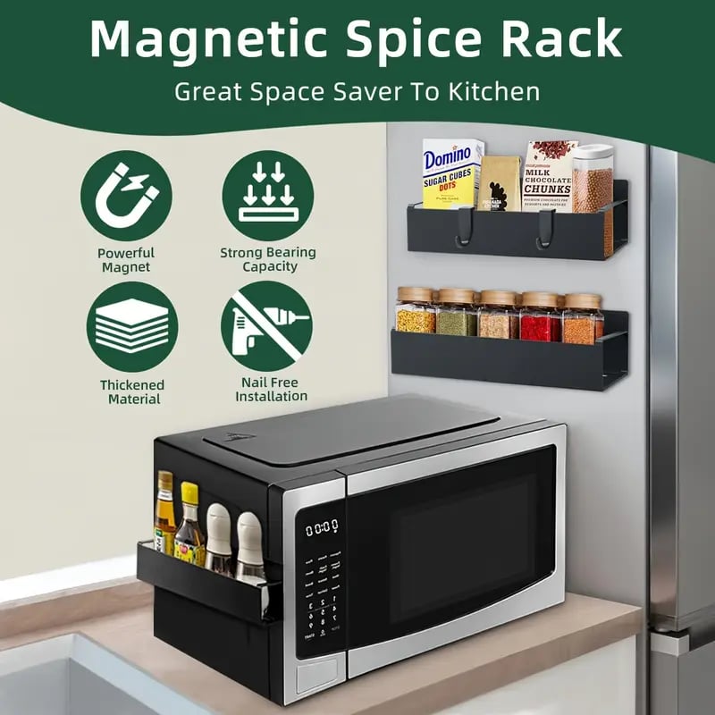 Magnetic spice rack perfectly saves kitchen counter space, use the space on the side of the refrigerator for storage, super strong magnet, not easy to slip off. The spice rack can perfectly store spices, jars, oil, salt, coffee, beverages, etc., so that you can cook in the kitchen can make a big difference, not limited by too little space